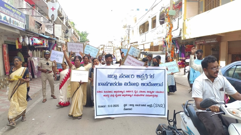 Health activists and communities resist government plans to privatize district public hospitals through PPPs in Karnataka, India.