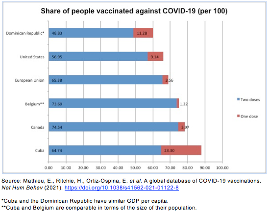 Amid this dismal picture worldwide, Cuba presents an alternative. The Caribbean island continues with its very successful vaccination drive using homegrown, public sector vaccines. This time, Data speaks shows that Cuba has managed to catch up – and in some cases surpass – the vaccination rates of rich countries, although its vaccine rollout started months later.
